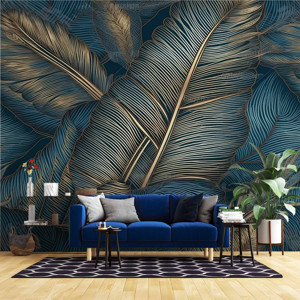 Mavi Tonlu Altın Yaprak Desenli Duvar Kağıdı