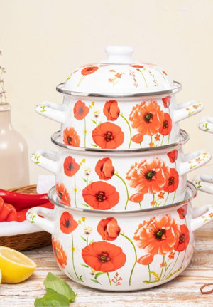 Emaye Güveç Çiçek Desenli Midi 3'Lü Tencere Seti 16/18/20 Cm