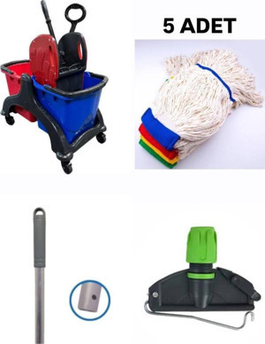 Çift Kovalı Plastik Temizlik Arabası Paspas Arabası Islak Mop Seti 5 Adet Islak Mop