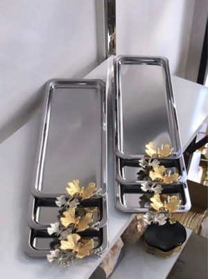 Paslanmaz Çelik Kare Model 3 Lü Kahve Tepsisi Kelebek Aksesuarlı Sunum Lüx