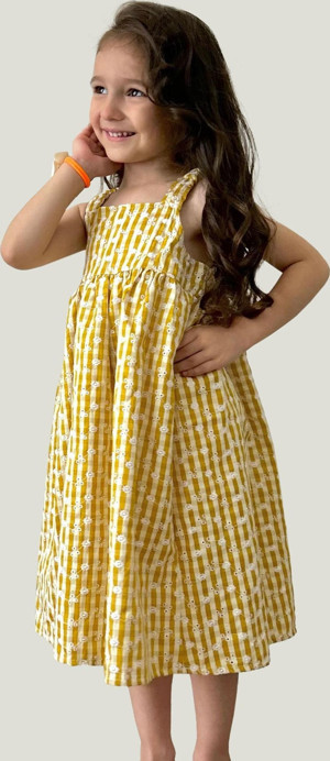 Kız Çocuk Elbise Çiçek Nakışlı Pötikare Desenli 5-9 Yaş, Hardal Sarı