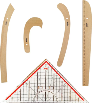 5 Parça Set - 4 Parça Ahşap Riga Seti ve Modelist Gönyesi - Riga Takımı - Dikiş Seti Cetvel