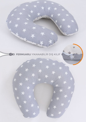 Çift Taraflı Emzirme Yastığı Bebek Destek Minderi Hamile Yastığı %100 Pamuk - Bebek Gri Yıldız