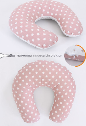 Çift Taraflı Emzirme Yastığı Bebek Destek Minderi Hamile Yastığı %100 Pamuk - Bebek Pembe Yıldız
