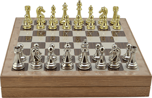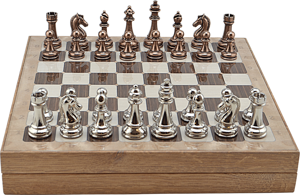 Metal KLASİK Satranç Takımı Parlak ve Rustik Desenli MDF Sandıklı Satranç Tahtası (36X36X6 cm.)