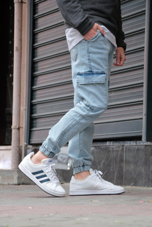 Erkek Buz Mavi Jogger Kargo Kot Pantolon - Likralı Ve Lastikli Bel Paça