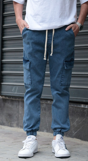 Erkek Buz Mavisi Jogger Kargo Cepli Kot Pantolon - Lastikli Bel Ve Paça, Esnek Kumaş