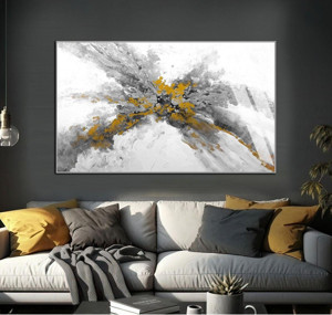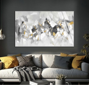 Gri - Sarı Soyut Şekilli Modeli Çerçeveli Temperli Cam Tablo Tekli Yatay