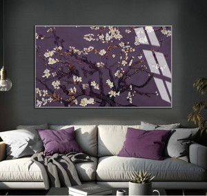 Mürdüm - Gri Çiçekli Dallar Modeli Çerçeveli Temperli Cam Tablo Tekli Yatay