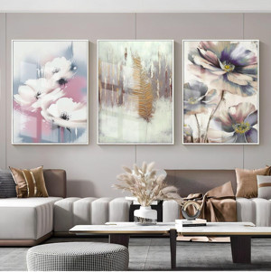 Soft Pembe - Beyaz Soyut Çiçek Kombini Çerçeveli Cam Tablo 3'Lü Dikey