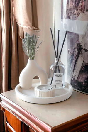 Beyaz Renk Özel Tasarım Fresh Oda Kokulu Ve Lotus Mum Halka Vazolu Standlı Aksesuar Seti