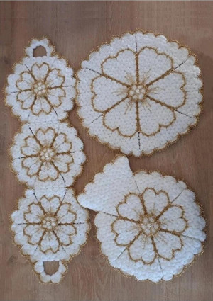 Çeyizlik El Örgüsü 3'lü Lif Seti Kalpli Gold Simli Beyaz