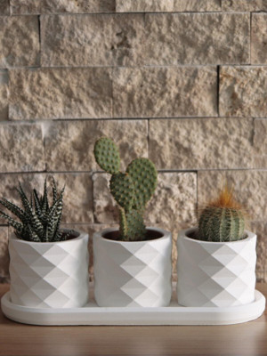 Prizma Sukulent Saksı Oval Tabaklı 3 lü Set Dekoratif Hediyelik Ham Beyaz Renk Beyaz