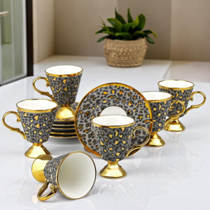 KOSOVA Porselen 6’lı Ayaklı Leopar Fincan Takımı – Gri & Gold Detaylı Şık Kahve Seti 90 cc