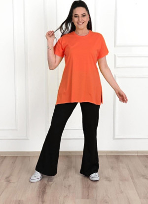 Kadın Bisiklet Yaka Yırtmaç Detaylı Büyük Beden Tshirt 9633-22 Turuncu XL