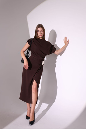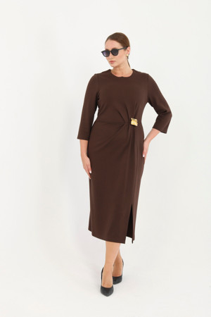 Modern Drapeli 'Kahverengi' Küçük Beden Beli Tokalı Midi Elbise