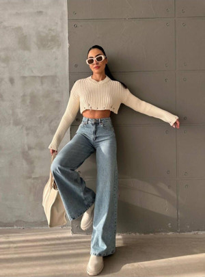 Lamira Palazzo Bej %100 Pamuk Yüksek Bel Salaş Wide Leg Jeans