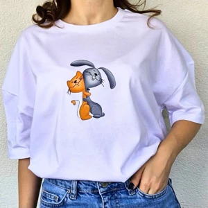 Baskı Beyaz Pamuklu Karikatür Baskılı Oversize Tshirt