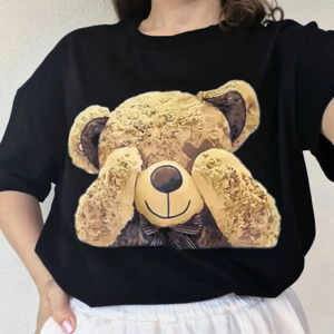 Baskı Siyah Pamuklu Ayıcık Desenli Baskılı Oversize T-shirt