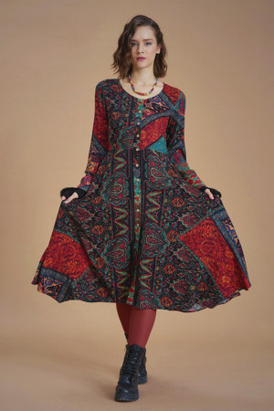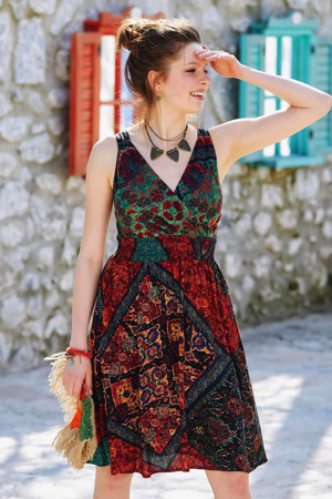 U Yaka Kedi Figürlü Düğme Detaylı Bohem Elbise