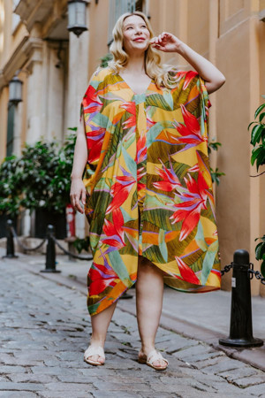 Sarı Desenli Kayık Yaka Büyük Beden Elbise