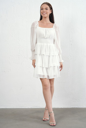 Kadın Eteği Kat Detaylı Astarlı Şifon Kumaş Beyaz Abiye Elbise 078