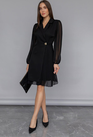 Eteği Piliseli Kruvaze Ceket Yaka Kolları Tül Detaylı Siyah Abiye Elbise 24K2169