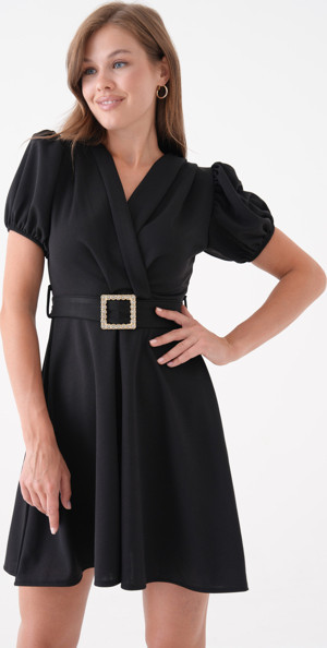 Kadın Krep Kumaş Kuşak Detaylı V Yaka Balon Kollu Siyah Mini Abiye Elbise 77125