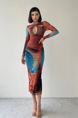 Barış Sülün Lovebox Kadın Esnek Dijital Baskılı Sandy Kumaş Uzun Kollu Basic Midi Elbise 324