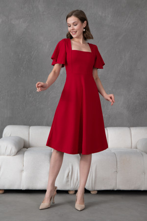 Barış Sülün Lovebox Kol Detaylı Esnek Scuba Krep Kumaş Kare Yaka Midi Boy Kırmızı Abiye Kırmızı Mezuniyet Elbisesi 082