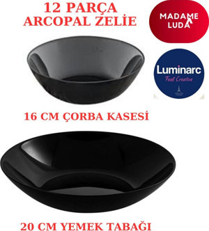 Madame Luda Arcopal Zelie Siyah Yemek Tabağı & Çorba Kasesi.12 Parça 6 Kişilik Yemek Takımı.