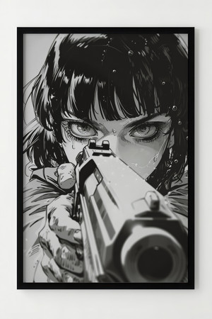 Çerçeveli Siyah Beyaz Anime Kadın Silahı Poster - Modern Duvar Dekoru