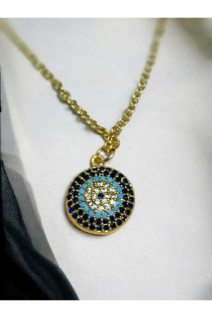Altın Kaplama Lacivert & Turkuaz Taşlı Yuvarlak Medallion Kolye - Zarif Nazar Desenli
