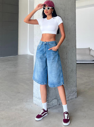 Toka Detaylı Bol Kesim Rahat Baggy Jean Kot Salaş Kadın Bermuda Diz Altı Denim Şort @Casoria