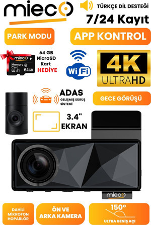 Mieco A7 4K UHD / Wifi / ADAS / 150° Ultra Geniş Açı / Gece Görüşü / Ön + Arka Araç Kamerası (2025) + Hafıza Kartı Hediyeli