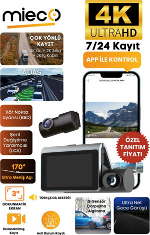 Mieco X18 Wifi /4K UHD/ 170° Ultra Geniş Açı/ ADAS/ G-Sensör / 3 Kameralı Araç Kamerası