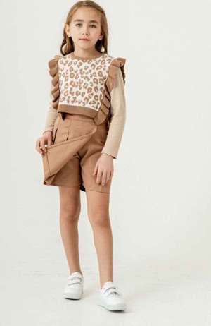 Leopar Triko Desenli Fırfırlı Kız Çocuk Şort Etekli Takım - Açık Kahve
