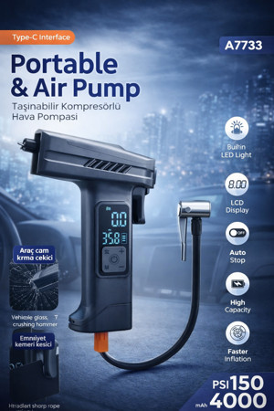 Taşınabilir Dijital Hava Pompası 150 Psı Şarjlı Mini Kompresör | Lcd Ekranlı, Otomatik Duran,