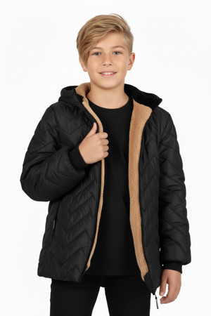 Siyah Zigzaglı Su Ve Rüzgar Geçirmez İçi Wersoftlu Kapüşonlu Erkek Çocuk Montu