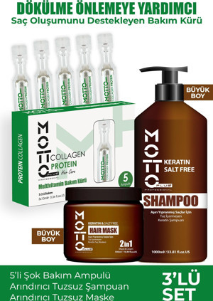 Yavaş Uzayan-Aşırı Yıpranmış Saçlar İçin Tuzsuz Keratinli 3'lü Saç Bakım Seti (Şampuan-Maske-Ser