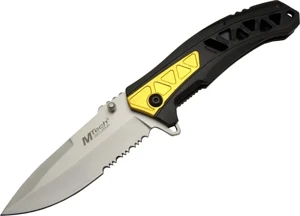 4191 Sarı Kamp Çakı 21cm - Yarı Otomatik, Kemerlikli, Testere Detaylı, Desenli Sap