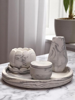 Mermer Desenli El Yapımı Beton Dekor Set Taş Tozu Mumluk Büyük Kutu Küçük Kutu Yuvarlak tealightlık Yuvarlak tepsi