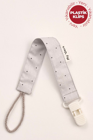 Gri Puantiyeli Emzik Askısı - Kumaş Pamuk Bağcıklı Emzik Zinciri - Emzik Tutacağı