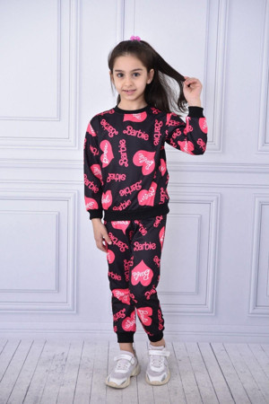 Kışlık Kalp Baskılı Barbie Şardonlu Lacivert Alt Üst Eşofman Takım Çocuk Giyim