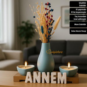 Annem Yazılı Dekoratif Hediye Seti - Çiçekli Vazo Kalp Mumluk Ahşap Stand