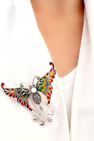 İnci DetaylıKelebek Figürlü Özel Mineli Vitray İşçiliği 925ayar Gümüş Tasarım Yaka İğnesi Broş ve Kolye