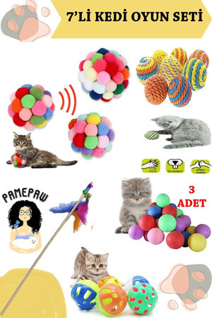 7Li Set : Kedi Ponpon Top , Sarma Top , Olta , 3Lü Mini Top , Çıngıraklı Top