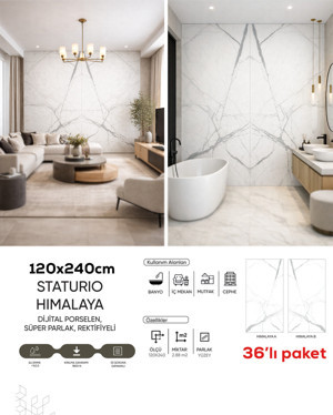 Staturio Himalaya 36'Lı Paket 120X240 Cm Dijital Porselen – Süper Parlak, Rektifiyeli