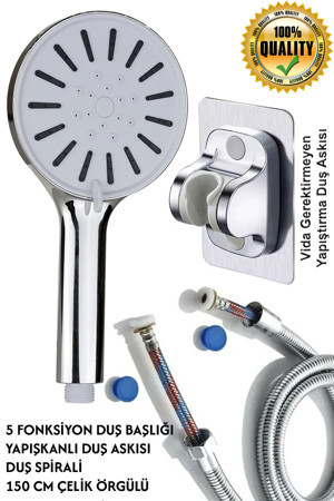 Kaliteli Tayzikli 5 Fonksiyon Duş Başlığı + Spiral Çelik Örgülü Duş Hortumu + Yapışkanlı Mafsal