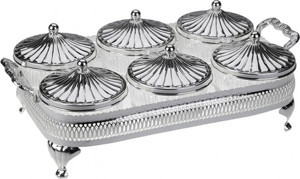 Gümüş Cam 6 lı Sunum Tepsili Kapaklı Kase Set 38*21